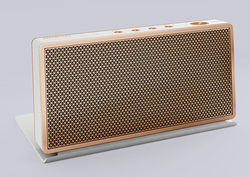 小型ながら38mmフルレンジスピーカー2基とパッシブラジエーター1基を搭載。再生周波数帯域は100Hz〜20kHzで、最大出力は8W。USB出力端子も備え、スマホなど外部機器への給電が行える。そのほか、スタンドとしても使える着脱式のレザータイプ素材の専用カバーが付属する。