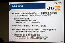 DTS:Xは、DTSによるオブジェクトオーディオ・フォーマット。DTS-HDマスターオーディオが再生できるBDプレーヤーならば再生が可能で、この点はアトモスと同様。DTS:X非対応のAVアンプと組み合わせた場合は、DTS-HDマスターオーディオとして再生される。現時点では最大11.2chまでがサポートされているが、規格上は最大32のスピーカーの使用が定義されている(サブウーファー2基含む)。非DTS:Xコンテンツに対するアップミックス再生機能「DTS Neural:X」も用意している。