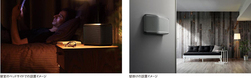 本体にWi-FiとBluetoothモジュールを内蔵しており、ネットワーク経由による音楽再生機能とBluetooth再生機能を搭載するスピーカー。本体サイズ243W×157H×113Dmm、質量2.2kgのコンパクトなサイズを実現し、インテリアに溶け込むようデザイン性にも配慮。壁掛けにも対応している。