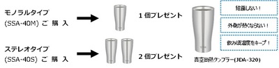 同キャンペーンは、一人でも多くの人に真空サウンドを体感してもらうことを目的に実施される。モノラルタイプ「SSA-40M」を購入の場合はタンブラー1個プレゼント、ステレオタイプ「SSA-40S」を購入の場合はタンブラー2個プレゼントとなる。なお、キャンペーンの対象となるのは期間中に購入した製品に限られる。