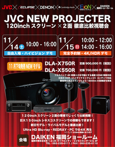 ホームシアター専門店「EioN」は、JVCの4K投写に対応するD-ILAプロジェクター「DLA-X750R」と「DLA-X550R」の比較視聴会をDAIKEN福岡ショールームにて11月14日・15日に開催する。時間は10時から16時までで、15日のみ要予約となる。