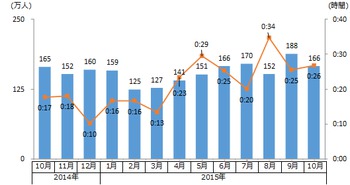 また訪問者一人当たりの月間での平均滞在時間は、3時間半前後で安定して推移している。