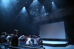 特設シアターは、右目・左目用に2つの8K映像を投射し、パッシブ3Dメガネを用いて鑑賞するというスタイル。観客席の周囲を8Kスーパーハイビジョンの22.2chスピーカーが取り囲み、3D映像と22.2chサラウンドを体験できるようになっている。