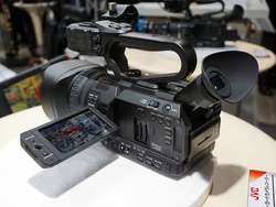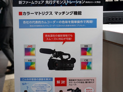 JVCケンウッドは、「GY-HM200」や「GY-LS300CH」といった4Kカムコーダーを展示。「GY-HM200」については、各社の代表的カムコーダーの色みを簡単に再現できる「カラーマトリクスマッチング機能」に対応する新ファームウェアを年内に提供予定であることも明かしていた。