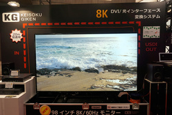 8Kでは、NHKがBOE製98インチディスプレイを用いた8Kシアターを設けてデモ。近くに位置する計測技研ブースからの8Kコンテンツを光ケーブルで伝送しての上映デモを行っていた。