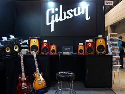 ギブソンもInter BEEに出展。「LP8TB」「LP6C」「LP4TB」といったスピーカーを、ギターとともに並べている。