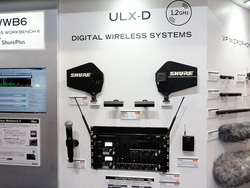 Shureでは、電波法改正によって2019年4月から特定ラジオマイクの周波数帯移行が行われることを受けて、新周波数帯に対応したワイヤレスマイクなど業務機器を取り揃えていることを紹介。「Shure is READY」のキーワードを用いてアピールしている。