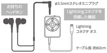 アダプターから伸びるLightningケーブルをiPhoneやiPad、iPod touchと接続し、iOSデバイスから供給される電力のみで駆動するハイレゾ対応のDAC/ヘッドホンアンプ。Lightningケーブルのケーブル長は約60cm。