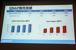 Chen氏は、QNAPの販売状況についても紹介した。QNAPのワールドワイドの販売は2012年の185億円から、2015年には240億円に伸張する見込み。日本市場についても、2012年の7億円から、2015年には12億円へと、約7割成長する予測となっている。