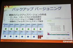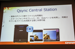 また同期機能では、「Qsync Central Station 2.0」について紹介。Qsync Central Stationは複数のデバイス間でファイルを同期するもので、スマホやタブレット、PCとNASを接続し、NASにバックアップフォルダを作るというもの。今回の2.0では、データベースを新設計したほか同期アルゴリズムも改善し、これまでにくらべ負荷を軽減しつつ、同期のスピードを大幅に高めた。また、同期に関する設定を、IT責任者が中央管理することも可能にした。