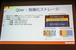 パフォーマンス向上では「Qtier」技術が強くアピールされた。Qtierはストレージを階層化してマネージメントするシステムで、たとえばSSDとSAS、SATAを組み合わせ、最もよく使うデータをより快速なドライブに置くといった最適化を自動的に行い、全体のパフォーマンスを高めるというもの。Tsao氏は「これは素晴らしい機能」と強調し、「通常はハイエンドNASでしか使えない技術」とアピールした。