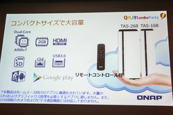 「TAS-168」「TAS-268」は、Android 4.4.4 OSとQNAP独自のQTS 4.2 OSを両方備えているNAS。これは業界初で、「2TBのHDDを搭載しており、容量不足の心配も無い」と神崎氏はアピール。メモリは2GB DDR3を採用しているほか、USBは5系統(USB3.0×1/USB2.0×4)を備えており、キーボードはもちろん、将来的な拡張性にも配慮したという。LAN端子×1、HDMI×1を装備している。
