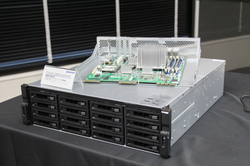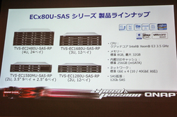 日置氏が紹介したのはラックマウントタイプの製品で、「QNAPは実はラックマウントも豊富にラインナップしており、1Uの4ベイ製品から24ベイまで用意している」と紹介。中でも今回の新製品「ECx80-SAS」は最上位機にあたるモデルで、12Gb/sのSASを搭載したことが大きな特徴。これまでの製品に比べ37%のパフォーマンス向上を果たした。