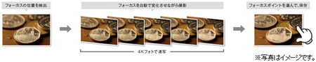 この機能はパナソニックの「4K PHOTO」機能と空間認識AF技術を組み合わせたもの。被写体のフォーカスポイントを瞬時に算出したあと、30コマ/秒で近くから遠くの被写体にフォーカスを移動させながら撮影することで、撮ったあとから好きなフォーカスポイントの写真を選ぶことができる。