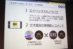 「ゲオチャンネル」は2016年2月にスタート予定の新サービス(関連ニュース)。特徴は、オンライン配信とリアル店舗を組み合わせた「ハイブリッドVOD」である点だ。エイベックスが保有するコンテンツや編成ノウハウに、ゲオのリアル店舗での顧客データ等を元にしたレコメンドエンジンを組み合わせて提供する。