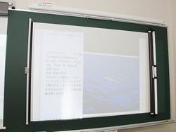 続いて文教向けスクリーンなどを含むBtoB向けのスペースには、OSのスクリーン各種が展示されていた。短焦点プロジェクターとの組み合わせを推奨しているサイドテンションスクリーン「SVS-63FN-H-WV102」「SVS-83FN-H-WV102」は、専用の生地を採用し最適なテンションをかける理想的なサイドカーブを追求した製品。会場では、わずか1.1m距離から100インチ投写が行えるオプトマの短焦点プロジェクター GT1080と組み合わせたデモを実施していた。