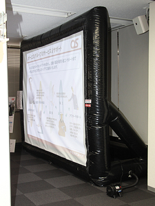 会場には、空気で膨らませる自立型スクリーン「インフレーター」の実物も用意されていた。付属のエアーポンプで空気を送り込むだけで自立するスクリーンで、自立用金具や支柱などが不要なのが特徴だ。