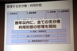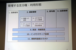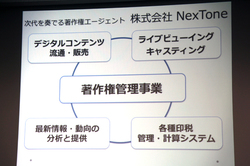 NexToneでは、JASRACにはない強みであるデジタルコンテンツの流通・販売事業やライブビューイング/キャスティングサービスといったマーケティング/販売促進事業をテコに、著作権管理事業へも誘導を図っていく戦略だ。荒川氏は「既にイーライセンスでこういった周辺事業に取り組んでおり、(イーライセンスの)売上げの半分は周辺事業という実績も出せている」と自信を見せる。なお周辺事業にエイベックスグループが関与することは今後もない、と断言し「JASRACからエイベックスのプラットフォームに取り込まれることになるだけでは?」という質問に答えた。
