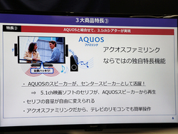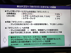 シャープ(株)は、液晶テレビ“AQUOS”に取り付けられるハイレゾ対応の“サイドバーシアターシステム”「HT-SP100(関連ニュース)」の製品説明会を開催した。設置性に配慮した製品構成や、ただスペックに準拠しただけではないハイレゾ対応の高音質設計など、製品の詳細が語られた。
