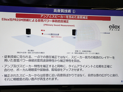 アンプおよびスピーカーの特性を補正し、タイムアラインメントと位相を正確にあわせ、ボーカルの明瞭度や躍動感、臨場感を向上させるという。これによって原音に近く、自然な音場の再生を実現するとしている。開発時には、このEilex PRISMで左右チャンネルそれぞれの特性を算出してイコライジングを行ったとのこと。