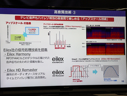 アップコンバート技術としては、「Eilex Harmony」「Eilex HD Remaster」の2つが採用されている。圧縮音源の音声情報を復元させるEilex Harmonyと、通常のオーディオソースをハイレゾ相当にリアルタイム処理するEilex HD Remasterを併用する。これによって、超音波帯域に自然界と近い正しい倍音成分を加えて40kHzまで生成するという。