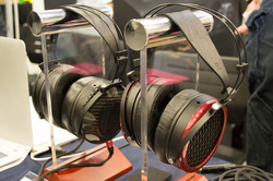この秋のヘッドホン新製品の中でも注目を集めたモデルのひとつ、米MrSpeakersのV-Planar振動板を搭載した平面磁界駆動型ヘッドホン「ETHER」「ETHER C」も登場。2.5mm4極端子を搭載したバランス駆動用オプションケーブルも併せて展示されていた。