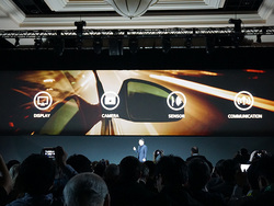 次に、話のバトンは同社CTO スコット・アーン博士に移った。スコット氏は「IoTと自動車とプレミアムプロダクト」について語り、全方位の窓に情報を表示する技術や、自動的な安全走行技術など、次世代の自動車に使われる技術を紹介した。「ディスプレイ、カメラ、センサー、コミュニケーションをどう統合していくか?」が課題だという。