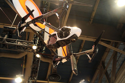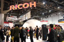 リコーは全天球カメラ「THETA」を大々的にアピールしていた。ブースの周囲では、モノリスのように屹立する大きなTHETAがお出迎え。ブース中央にはテントが用意され、中に入るとTHETAで撮影した全天球写真が、文字通り全天球に投映されている。