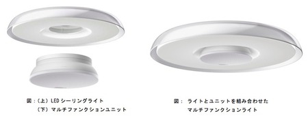 LEDシーリングライトとマルチファンクションユニットのセット。ユニットには赤外線センサーやWi-Fi、人感センサー、照度センサー、IRコントローラー、スピーカー等を内蔵している。