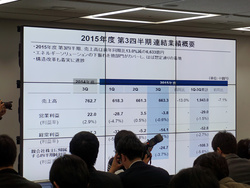 シャープ(株)は、平成28年3月期第3四半期累計期間(平成27年4月1日〜平成27年12月31日)の連結業績を発表した。売上高は1兆9,430億円、営業損益は290億円の損失で、1,083億円の赤字となった。なお、同社は本日開催の取締役会において、亀山第2工場の収益力改善を図る設備投資を行うことも発表している(詳細はこちら)。