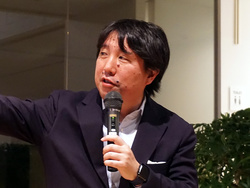 両製品の開発者が登壇してのトークセッションも実施。ポータブル超短焦点プロジェクター「LSPX-P1」の開発者であるデバイスソリューション事業本部 新規事業部門 ポータブルプロジェクタモジュール事業室 統括課長の松田幹憲氏は、「当時、(プロジェクターの開発などを行っている)厚木工場の夏祭りに社長の平井が来たときに試作機のプレゼンを行った。目立つように若手社員がRGB各色のTシャツを着てプレゼンした。まさか夏祭りでやるとは思わなかった(笑)」と、裏話も交えながら開発の経緯を説明するなどした。