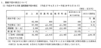 また、2015年度の通期業績予想を下方修正。売上高は670億円と、前回予想より20億円追加されたものの、営業損益は8億円の黒字から15億円の赤字に、経常損失も5億円の黒字から19億円の赤字に修正された。一方、純利益は4億円の予想から5億円に上方修正した。