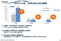 2015年度3Qは、オンキヨーとパイオニアのホームAV事業統合による生産統合などが一部スタート。ヘッドホン新製品も積極的に投入したほか、ハイレゾDAPが非常に好調に推移した。またOEM事業では、従来の技術を応用しPA機器事業に参入したほか、河合楽器との協業により電子楽器等の分野へも積極的に展開を進めている。
