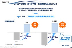 クリスマス商戦において主力AVレシーバーの販売不振があったものの、ヘッドホンやハイレゾDAPの好調などにより、売上高は前回予想を上回る見込み。ただしユーロの対ドル為替レートの下落およびパイオニアホームAV事業との統合に伴うシステム構築、インフラ整備費用、生産移管および調達機能統合などにかかわるコストが想定以上だったことなどから、営業利益および経常利益は下方修正するに至った。