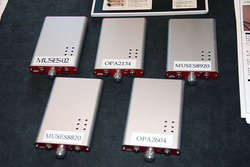 「TU-HP01」は、入力部に真空管、出力部にオペアンプを使用したハイブリッド構成のポータブルヘッドホンアンプ。オペアンプ部は差し替えが可能で、ブースには様々なオペアンプを使用したモデルも展示されていた。