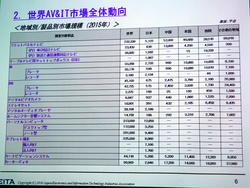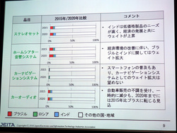 「AV&IT機器世界需要動向 〜2020年までの展望〜」と題した調査報告書を発行したことに際して、その内容を解説する発表会を開催したというもの。なお、今年度は調査対象品目へ新たにカーAVC機器(カーナビゲーション・カーオーディオ)を追加。また、デジタル・ビデオカメラ/ステレオセット/ホームシアター音響システムについては、ブラジル、ロシア、インドも調査対象国に加えるなど、調査対象品目と調査対象地域を充実させた。