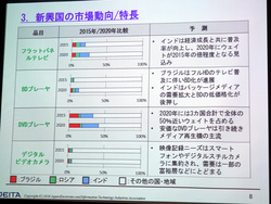 なお、新興国については、インドで経済成長とともにフラットパネルテレビの普及率が向上することで、世界市場における新興国の市場割合が2020年には2015年の倍程度になり、ブラジルでフルHDのテレビ普及に伴ってDVDからBDへの置き換えが進展する見込みであることも紹介している。