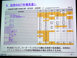 一般社団法人 電子情報技術産業協会(JEITA)CE部会は、2015年度のAV&IT機器世界需要動向調査の結果報告会を開催。テレビやオーディオ機器などの2020年までの市場動向見込みについて解説した。
