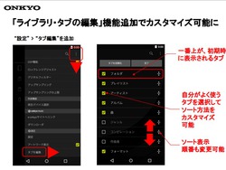 アップデートによって、階層表示タイプのフォルダ表示再生機能が追加。楽曲タイトルは3行表示まで可能なので、長い曲名でも安心とのこと。また、「フォルダ」「プレイリスト」などのタブの順番表示編集も可能になる。