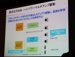 アンプ部では、ポータブルオーディオでは最大級となる、計50Wの出力を実現。内訳は低域用が15W×2ch、高域用は10W×2chとなる。どちらもデジタルアンプで、高域用と低域用にアンプを独立させることで最適な帯域分割を行う。