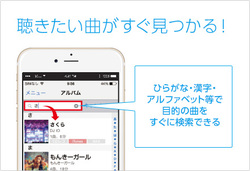 楽曲の検索機能も強化され、前方一致検索に対応。アーティスト名・アルバム名・曲名などについて、漢字・アルファベット等による検索ワードの頭出し表示が行えるようになった。