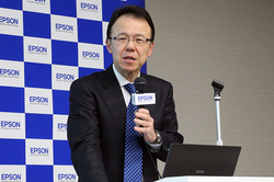 本日行われた発表会に登壇したエプソン販売 代表取締役社長の佐伯直幸氏は、新製品について「レーザー光源採用モデルはビジネスユースでは初だが、既にコンシューマー向けで実績を持っている。他のレーザー採用機と比べて際立ったコストパフォーマンスの良さを獲得している」と自信を見せた。
