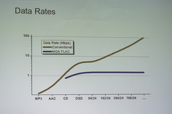 会場ではボブ・ディランやシナトラなどの50年代の録音、デジタルレコーディング初期に録音されたキース・ジャレットの「ケルン・コンサート」などをMQAエンコードしたものを試聴デモ。3階のブースでは、同一音源を通常のPCMとMQAエンコードのもので比較試聴することができた。実際に比較試聴してみたところ、特に古いモノラル録音であるシナトラの音源では、音の輪郭がハッキリして実在感が増した印象を受けた。詳細な比較試聴レビューはこちらからご覧いただける。