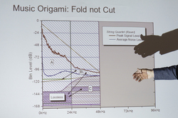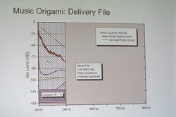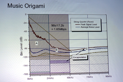 それを可能にしたのが「Music Origami」と呼ばれる独自のエンコードの概念だ。これは、超高域の周波数(図のC部)を「カプセル化」して図B部のノイズフロアの下に隠し、Bの部分をロスレスで圧縮。これをさらに図A部のノイズフロアの下に隠すというもの。「カプセル化」の方法の詳細については明らかにされていないが、ちょうど折り紙のように音楽情報を折りたたむことで大容量データをコンパクトにまとめることができ、MQAデコーダーでそれを展開するというしくみ。もしMQAデコーダーがない場合も、図A部を再生することはできるので、CDクオリティのサウンド再生は可能ということになる。
