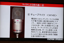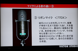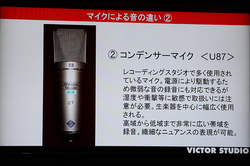 続いて、ダイナミックマイク/コンデンサーマイク/リボンマイク/真空管マイクで録音した音源の違いを聴き比べ。広さや響きの異なるビクタースタジオ内の各スタジオで録られた音も比較試聴した。