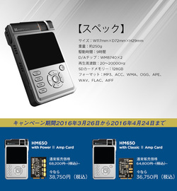 HIFIMAN JAPANは、ハイレゾ対応ポータブルオーディオプレーヤー「HM-650」を特別価格で購入できるキャンペーンを3月26日から4月24日まで実施する。