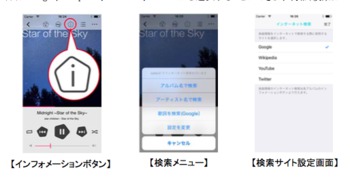 楽曲関連情報のインターネット検索機能も追加された。再生中の楽曲のアーティストやアルバムの情報、楽曲の歌詞をインターネットで検索できる。検索先はGoogle、Wikipedia、YouTube、Twitterから選択することができます(歌詞検索は Googleのみ)。