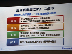また、今後とも個別事業部での取り組みを重要視し、立地・競争力に応じた事業戦略を実行する。「家電/住宅/車載」を含む高成長事業には、思い切ってリソースを集中させ、積極的な先行投資を実施し、1兆円戦略投資を継続して実施。ここで売上げと利益成長を牽引していく。また安定成長事業では、競争力を強化し、着実な売上げと利益創出を目指す。