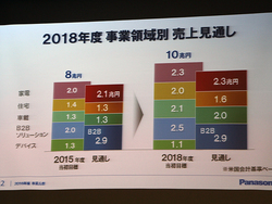 これら事業領域の見直しに伴い、2018年度の売上げ目標も変更された。既述の通り、昨年時点では2018年度に売上高10兆円を目指していたが、これを8.8兆円に引き下げる。事業領域別の内訳は、家電で2.3兆円、住宅で1.6兆円、車載で2.0兆円、BtoBで2.9兆円を、それぞれ目標にしている。