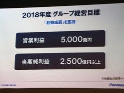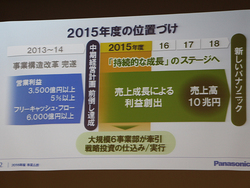 パナソニックでは、2014年度が終了した段階で営業利益3,500億円以上/利益率5%以上、フリーキャッシュ・フロー6,000億円以上という中期経営計画を前倒しで達成しており、そこから続く2015年度を「売上成長による利益創出の年」と位置づけていた。